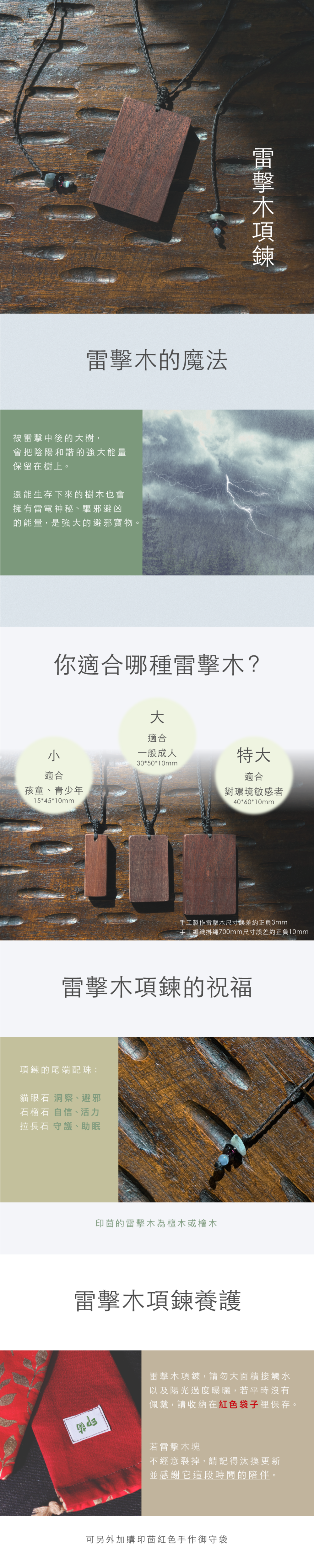 雷擊木選用檜木和檀木並且隨機出貨;項鍊的尾端會配珠,有石榴石、貓眼石、拉長石。